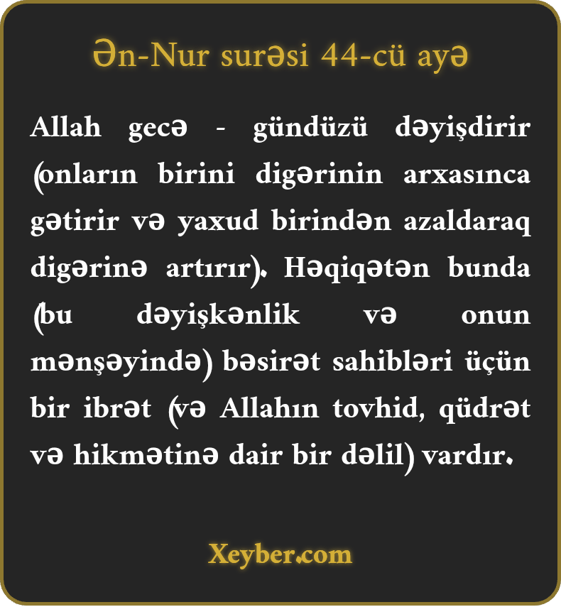 Allah gecə - gündüzü dəyişdirir (onların birini digərinin arxasınca gətirir və yaxud birindən azaldaraq digərinə artırır). Həqiqətən bunda (bu dəyişkənlik və onun mənşəyində) bəsirət sahibləri üçün bir ibrət (və Allahın tovhid, qüdrət və hikmətinə dair bir dəlil) vardır.