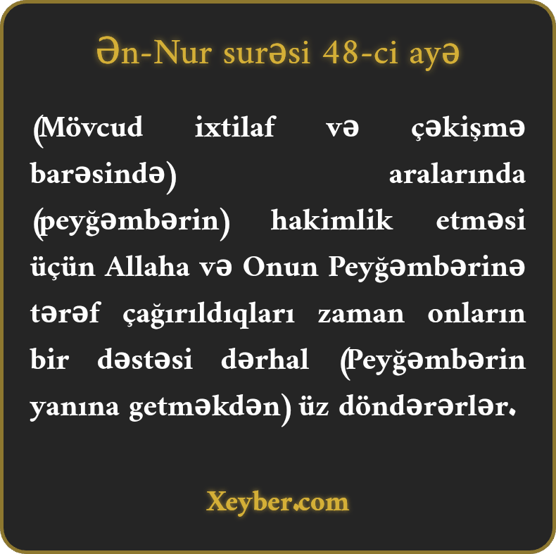 (Mövcud ixtilaf və çəkişmə barəsində) aralarında (peyğəmbərin) hakimlik etməsi üçün Allaha və Onun Peyğəmbərinə tərəf çağırıldıqları zaman onların bir dəstəsi dərhal (Peyğəmbərin yanına getməkdən) üz döndərərlər.