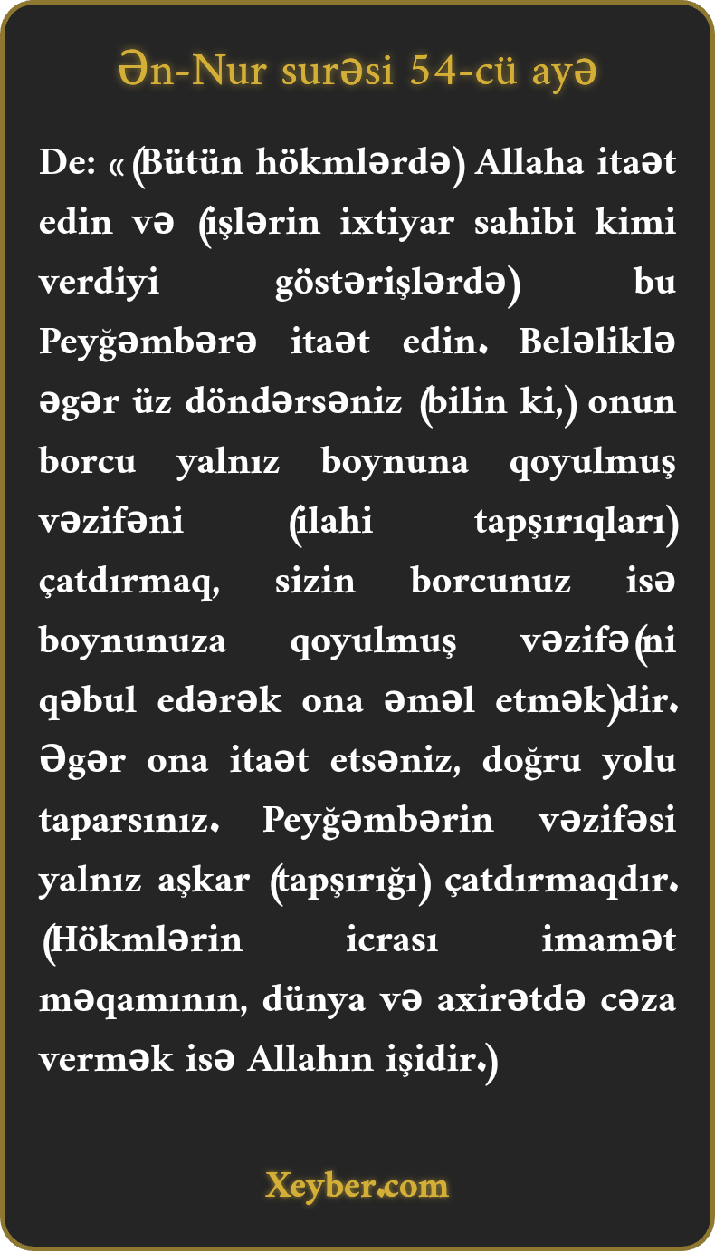 De: «(Bütün hökmlərdə) Allaha itaət edin və (işlərin ixtiyar sahibi kimi verdiyi göstərişlərdə) bu Peyğəmbərə itaət edin. Beləliklə əgər üz döndərsəniz (bilin ki,) onun borcu yalnız boynuna qoyulmuş vəzifəni (ilahi tapşırıqları) çatdırmaq, sizin borcunuz isə boynunuza qoyulmuş vəzifə(ni qəbul edərək ona əməl etmək)dir. Əgər ona itaət etsəniz, doğru yolu taparsınız. Peyğəmbərin vəzifəsi yalnız aşkar (tapşırığı) çatdırmaqdır. (Hökmlərin icrası imamət məqamının, dünya və axirətdə cəza vermək isə Allahın işidir.)