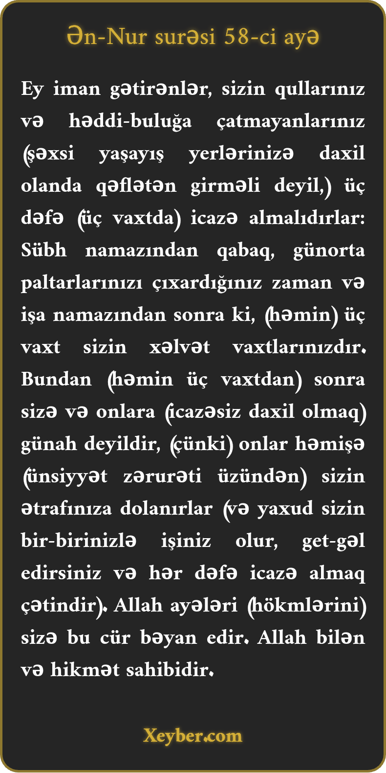 Ey iman gətirənlər, sizin qullarınız və həddi-buluğa çatmayanlarınız (şəxsi yaşayış yerlərinizə daxil olanda qəflətən girməli deyil,) üç dəfə (üç vaxtda) icazə almalıdırlar: Sübh namazından qabaq, günorta paltarlarınızı çıxardığınız zaman və işa namazından sonra ki, (həmin) üç vaxt sizin xəlvət vaxtlarınızdır. Bundan (həmin üç vaxtdan) sonra sizə və onlara (icazəsiz daxil olmaq) günah deyildir, (çünki) onlar həmişə (ünsiyyət zərurəti üzündən) sizin ətrafınıza dolanırlar (və yaxud sizin bir-birinizlə işiniz olur, get-gəl edirsiniz və hər dəfə icazə almaq çətindir). Allah ayələri (hökmlərini) sizə bu cür bəyan edir. Allah bilən və hikmət sahibidir.