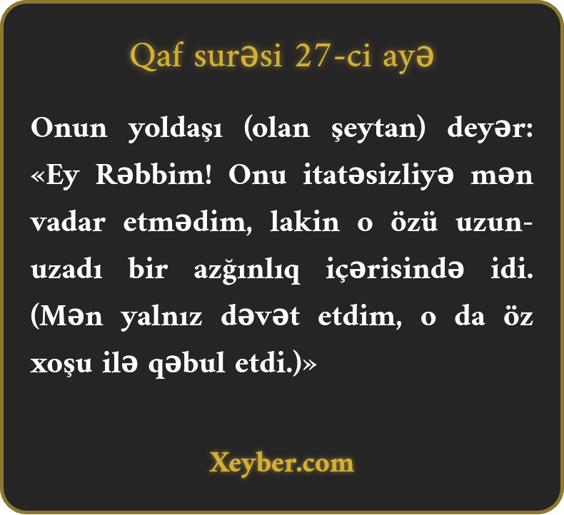 Onun yoldaşı (olan şeytan) deyər: «Ey Rəbbim! Onu itatəsizliyə mən vadar etmədim, lakin o özü uzun-uzadı bir azğınlıq içərisində idi. (Mən yalnız dəvət etdim, o da öz xoşu ilə qəbul etdi.)»