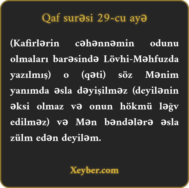 (Kafirlərin cəhənnəmin odunu olmaları barəsində Lövhi-Məhfuzda yazılmış) o (qəti) söz Mənim yanımda əsla dəyişilməz (deyilənin əksi olmaz və onun hökmü ləğv edilməz) və Mən bəndələrə əsla zülm edən deyiləm.