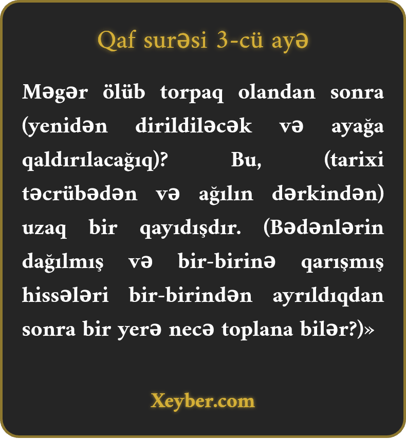 Məgər ölüb torpaq olandan sonra (yenidən dirildiləcək və ayağa qaldırılacağıq)? Bu, (tarixi təcrübədən və ağılın dərkindən) uzaq bir qayıdışdır. (Bədənlərin dağılmış və bir-birinə qarışmış hissələri bir-birindən ayrıldıqdan sonra bir yerə necə toplana bilər?)»