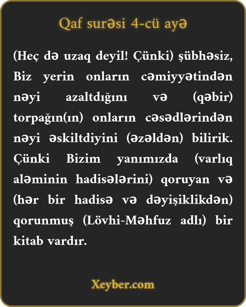 (Heç də uzaq deyil! Çünki) şübhəsiz, Biz yerin onların cəmiyyətindən nəyi azaltdığını və (qəbir) torpağın(ın) onların cəsədlərindən nəyi əskiltdiyini (əzəldən) bilirik. Çünki Bizim yanımızda (varlıq aləminin hadisələrini) qoruyan və (hər bir hadisə və dəyişiklikdən) qorunmuş (Lövhi-Məhfuz adlı) bir kitab vardır.