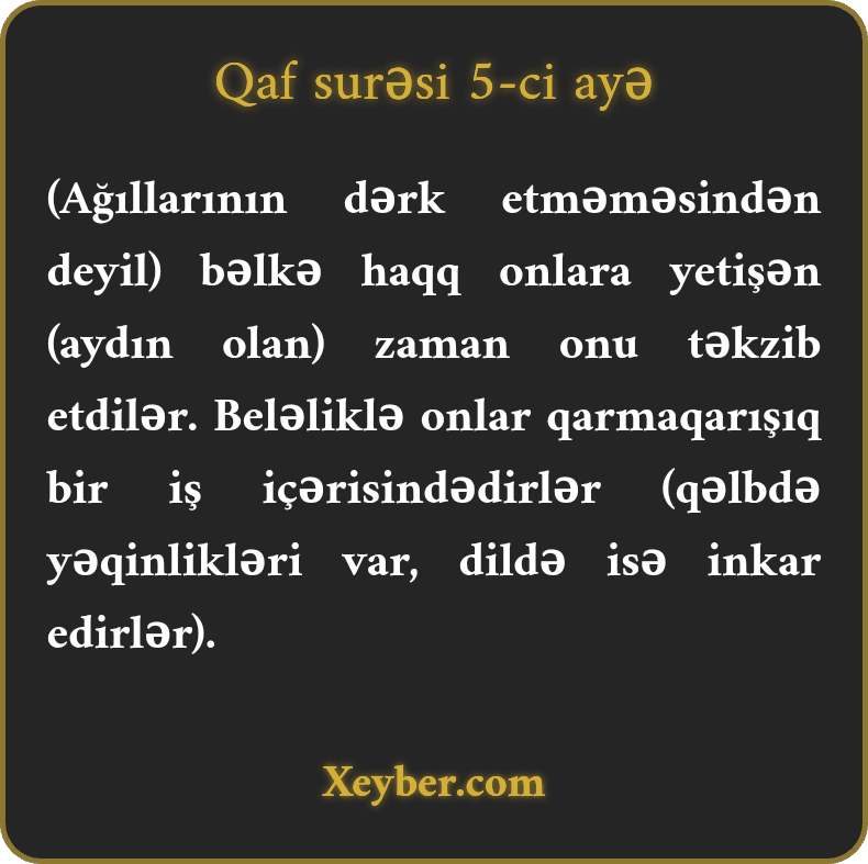 (Ağıllarının dərk etməməsindən deyil) bəlkə haqq onlara yetişən (aydın olan) zaman onu təkzib etdilər. Beləliklə onlar qarmaqarışıq bir iş içərisindədirlər (qəlbdə yəqinlikləri var, dildə isə inkar edirlər).