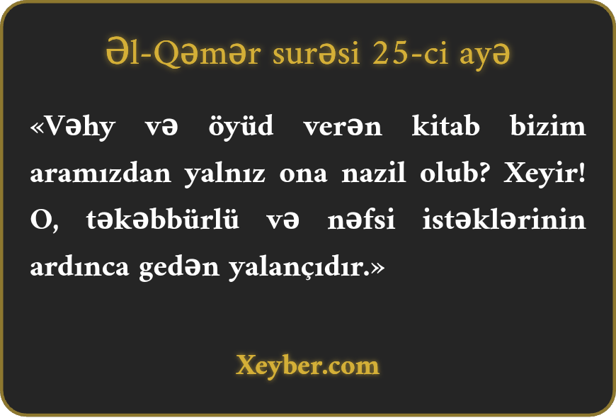 «Vəhy və öyüd verən kitab bizim aramızdan yalnız ona nazil olub? Xeyir! O, təkəbbürlü və nəfsi istəklərinin ardınca gedən yalançıdır.»