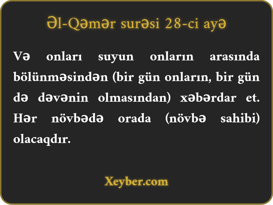 Və onları suyun onların arasında bölünməsindən (bir gün onların, bir gün də dəvənin olmasından) xəbərdar et. Hər növbədə orada (növbə sahibi) olacaqdır.
