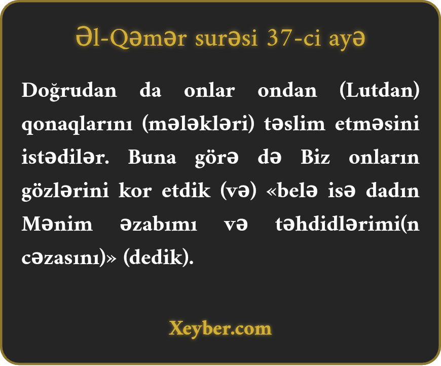 Doğrudan da onlar ondan (Lutdan) qonaqlarını (mələkləri) təslim etməsini istədilər. Buna görə də Biz onların gözlərini kor etdik (və) «belə isə dadın Mənim əzabımı və təhdidlərimi(n cəzasını)» (dedik).