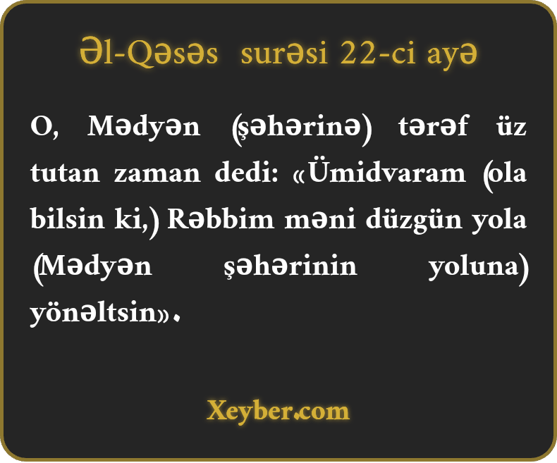 O, Mədyən (şəhərinə) tərəf üz tutan zaman dedi: «Ümidvaram (ola bilsin ki,) Rəbbim məni düzgün yola (Mədyən şəhərinin yoluna) yönəltsin».