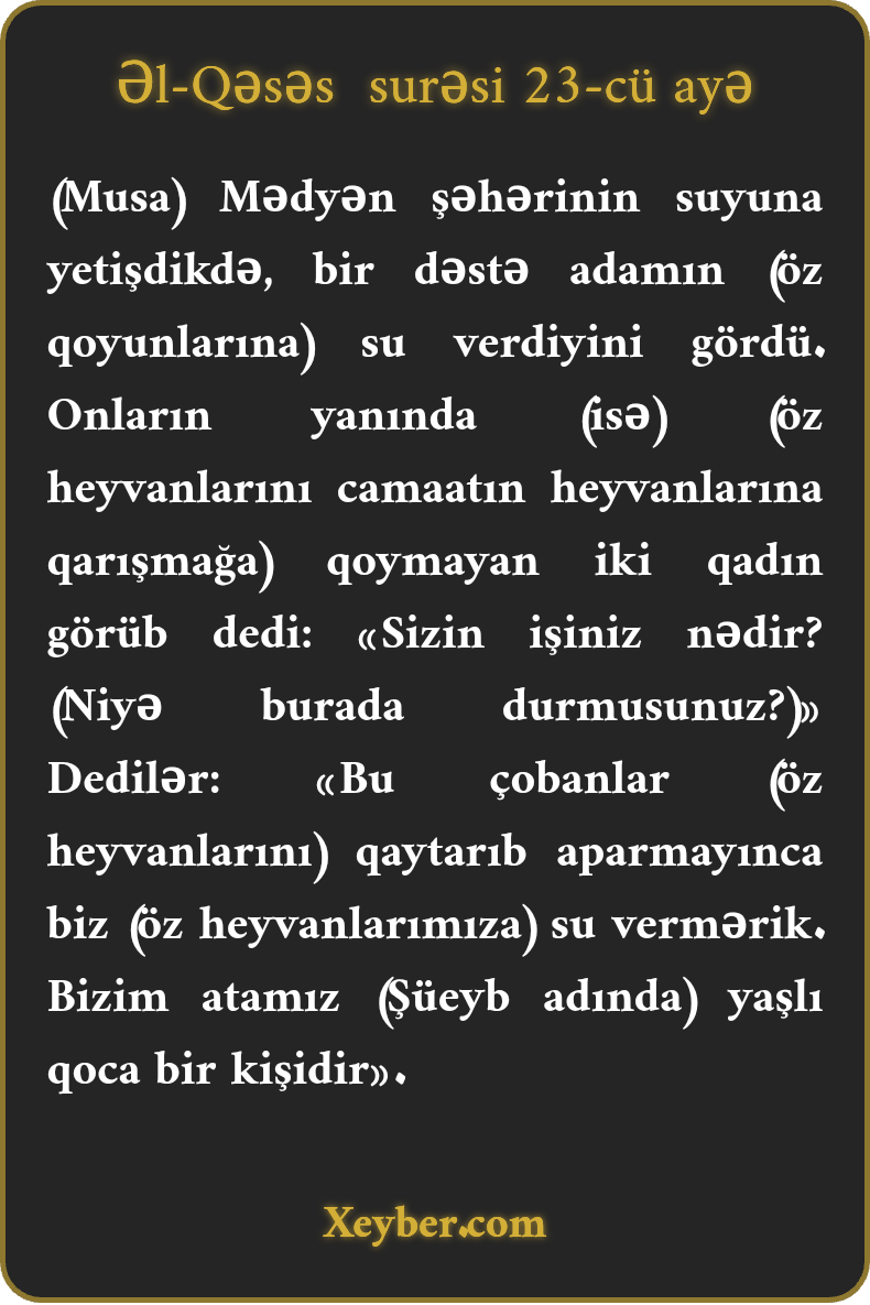 (Musa) Mədyən şəhərinin suyuna yetişdikdə, bir dəstə adamın (öz qoyunlarına) su verdiyini gördü. Onların yanında (isə) (öz heyvanlarını camaatın heyvanlarına qarışmağa) qoymayan iki qadın görüb dedi: «Sizin işiniz nədir? (Niyə burada durmusunuz?)» Dedilər: «Bu çobanlar (öz heyvanlarını) qaytarıb aparmayınca biz (öz heyvanlarımıza) su vermərik. Bizim atamız (Şüeyb adında) yaşlı qoca bir kişidir».