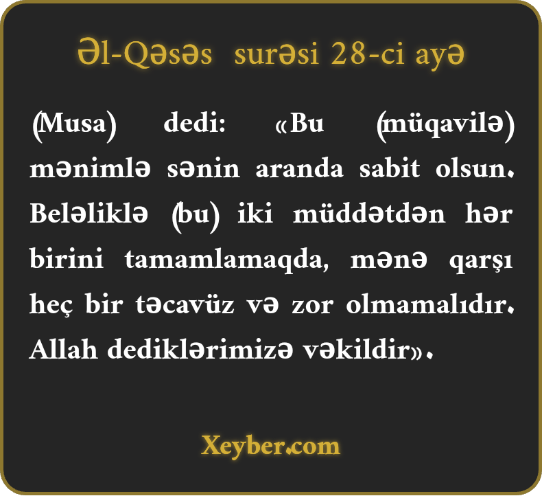 (Musa) dedi: «Bu (müqavilə) mənimlə sənin aranda sabit olsun. Beləliklə (bu) iki müddətdən hər birini tamamlamaqda, mənə qarşı heç bir təcavüz və zor olmamalıdır. Allah dediklərimizə vəkildir».