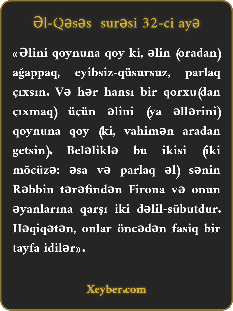 «Əlini qoynuna qoy ki, əlin (oradan) ağappaq, eyibsiz-qüsursuz, parlaq çıxsın. Və hər hansı bir qorxu(dan çıxmaq) üçün əlini (ya əllərini) qoynuna qoy (ki, vahimən aradan getsin). Beləliklə bu ikisi (iki möcüzə: əsa və parlaq əl) sənin Rəbbin tərəfindən Firona və onun əyanlarına qarşı iki dəlil-sübutdur. Həqiqətən, onlar öncədən fasiq bir tayfa idilər».