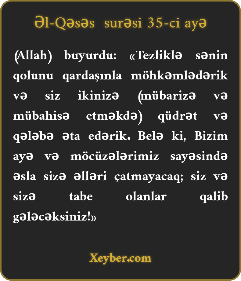 (Allah) buyurdu: «Tezliklə sənin qolunu qardaşınla möhkəmlədərik və siz ikinizə (mübarizə və mübahisə etməkdə) qüdrət və qələbə əta edərik. Belə ki, Bizim ayə və möcüzələrimiz sayəsində əsla sizə əlləri çatmayacaq; siz və sizə tabe olanlar qalib gələcəksiniz!»