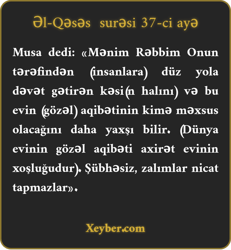 Musa dedi: «Mənim Rəbbim Onun tərəfindən (insanlara) düz yola dəvət gətirən kəsi(n halını) və bu evin (gözəl) aqibətinin kimə məxsus olacağını daha yaxşı bilir. (Dünya evinin gözəl aqibəti axirət evinin xoşluğudur). Şübhəsiz, zalımlar nicat tapmazlar».