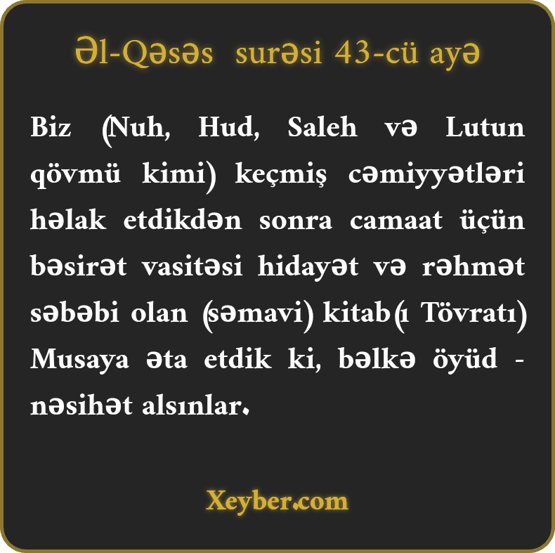 Biz (Nuh, Hud, Saleh və Lutun qövmü kimi) keçmiş cəmiyyətləri həlak etdikdən sonra camaat üçün bəsirət vasitəsi hidayət və rəhmət səbəbi olan (səmavi) kitab(ı Tövratı) Musaya əta etdik ki, bəlkə öyüd - nəsihət alsınlar.