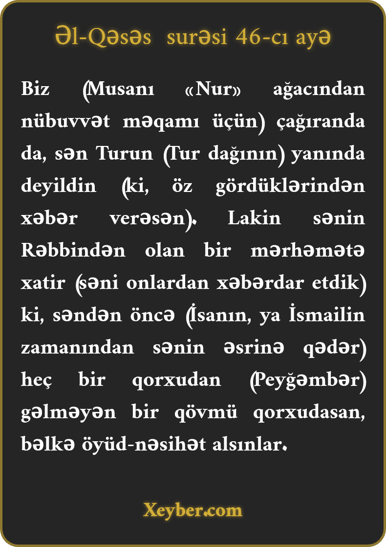 Biz (Musanı «Nur» ağacından nübuvvət məqamı üçün) çağıranda da, sən Turun (Tur dağının) yanında deyildin (ki, öz gördüklərindən xəbər verəsən). Lakin sənin Rəbbindən olan bir mərhəmətə xatir (səni onlardan xəbərdar etdik) ki, səndən öncə (İsanın, ya İsmailin zamanından sənin əsrinə qədər) heç bir qorxudan (Peyğəmbər) gəlməyən bir qövmü qorxudasan, bəlkə öyüd-nəsihət alsınlar.