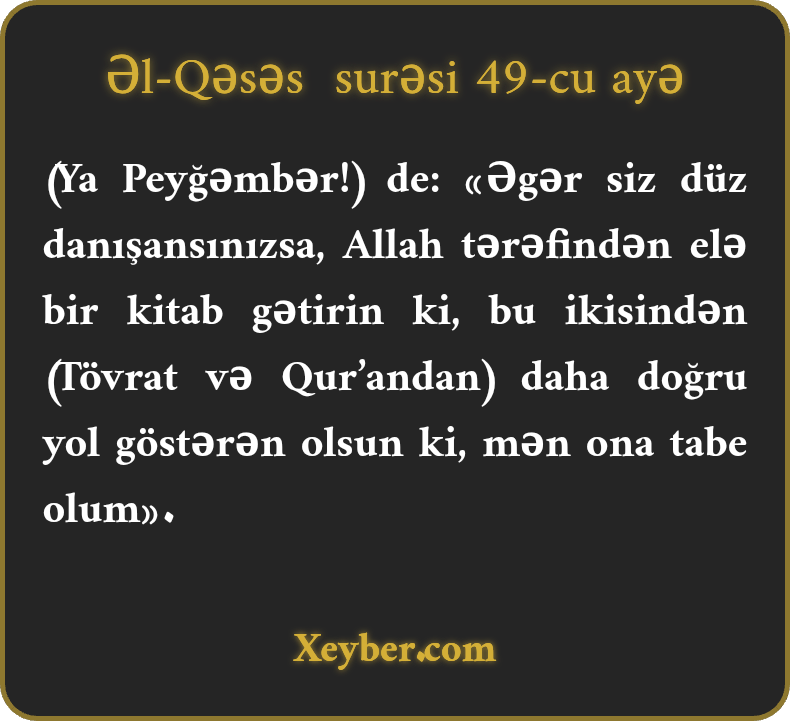 (Ya Peyğəmbər!) de: «Əgər siz düz danışansınızsa, Allah tərəfindən elə bir kitab gətirin ki, bu ikisindən (Tövrat və Qur’andan) daha doğru yol göstərən olsun ki, mən ona tabe olum».