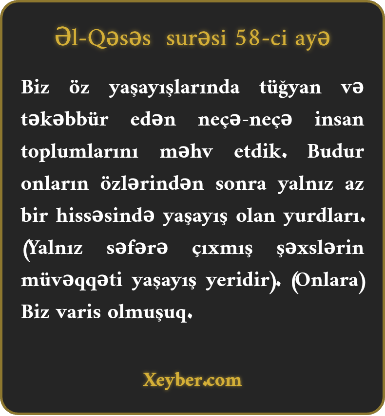 Biz öz yaşayışlarında tüğyan və təkəbbür edən neçə-neçə insan toplumlarını məhv etdik. Budur onların özlərindən sonra yalnız az bir hissəsində yaşayış olan yurdları. (Yalnız səfərə çıxmış şəxslərin müvəqqəti yaşayış yeridir). (Onlara) Biz varis olmuşuq.