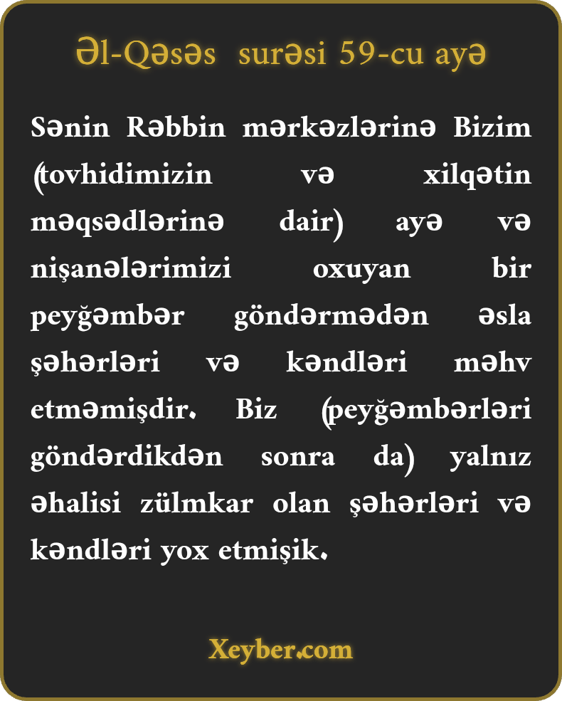 Sənin Rəbbin mərkəzlərinə Bizim (tovhidimizin və xilqətin məqsədlərinə dair) ayə və nişanələrimizi oxuyan bir peyğəmbər göndərmədən əsla şəhərləri və kəndləri məhv etməmişdir. Biz (peyğəmbərləri göndərdikdən sonra da) yalnız əhalisi zülmkar olan şəhərləri və kəndləri yox etmişik.