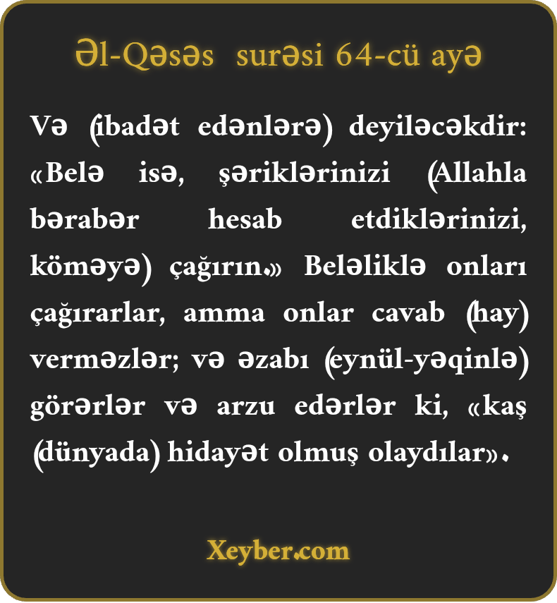 Və (ibadət edənlərə) deyiləcəkdir: «Belə isə, şəriklərinizi (Allahla bərabər hesab etdiklərinizi, köməyə) çağırın.» Beləliklə onları çağırarlar, amma onlar cavab (hay) verməzlər; və əzabı (eynül-yəqinlə) görərlər və arzu edərlər ki, «kaş (dünyada) hidayət olmuş olaydılar».