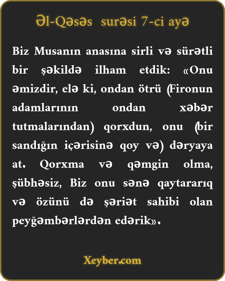 Biz Musanın anasına sirli və sürətli bir şəkildə ilham etdik: «Onu əmizdir, elə ki, ondan ötrü (Fironun adamlarının ondan xəbər tutmalarından) qorxdun, onu (bir sandığın içərisinə qoy və) dəryaya at. Qorxma və qəmgin olma, şübhəsiz, Biz onu sənə qaytararıq və özünü də şəriət sahibi olan peyğəmbərlərdən edərik».
