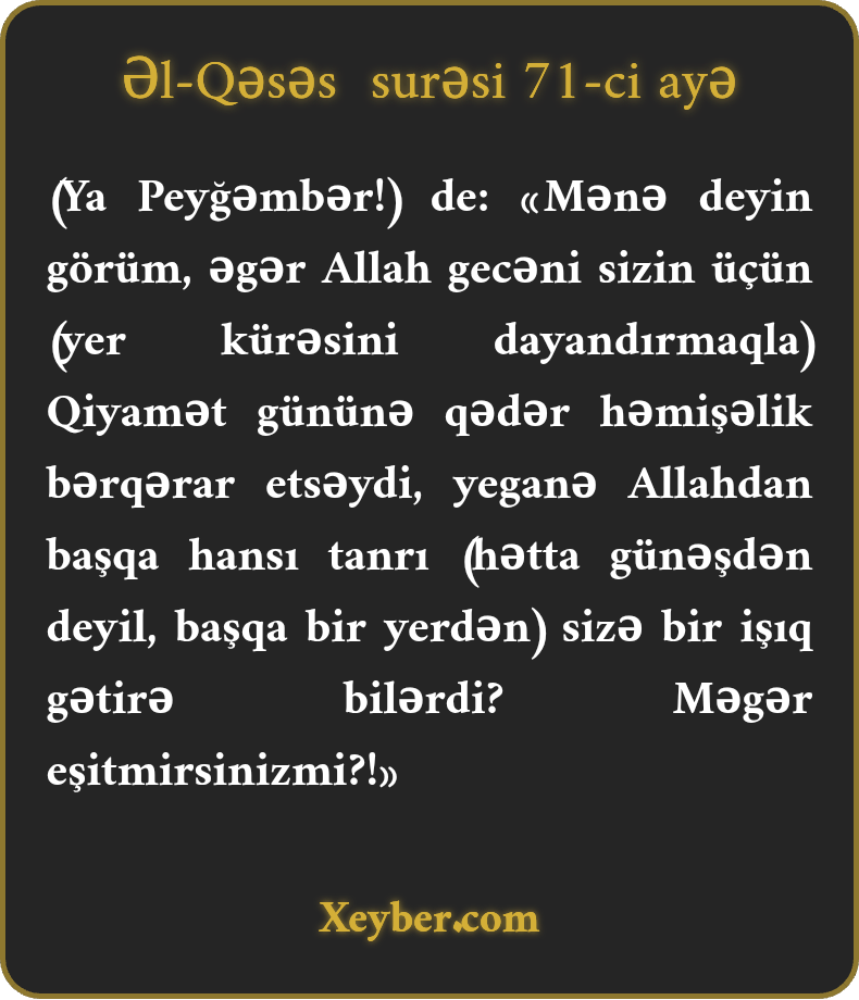 (Ya Peyğəmbər!) de: «Mənə deyin görüm, əgər Allah gecəni sizin üçün (yer kürəsini dayandırmaqla) Qiyamət gününə qədər həmişəlik bərqərar etsəydi, yeganə Allahdan başqa hansı tanrı (hətta günəşdən deyil, başqa bir yerdən) sizə bir işıq gətirə bilərdi? Məgər eşitmirsinizmi?!»