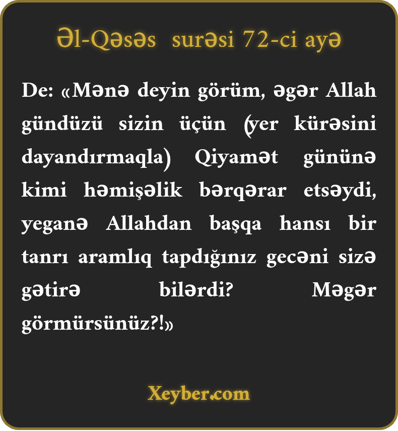De: «Mənə deyin görüm, əgər Allah gündüzü sizin üçün (yer kürəsini dayandırmaqla) Qiyamət gününə kimi həmişəlik bərqərar etsəydi, yeganə Allahdan başqa hansı bir tanrı aramlıq tapdığınız gecəni sizə gətirə bilərdi? Məgər görmürsünüz?!»