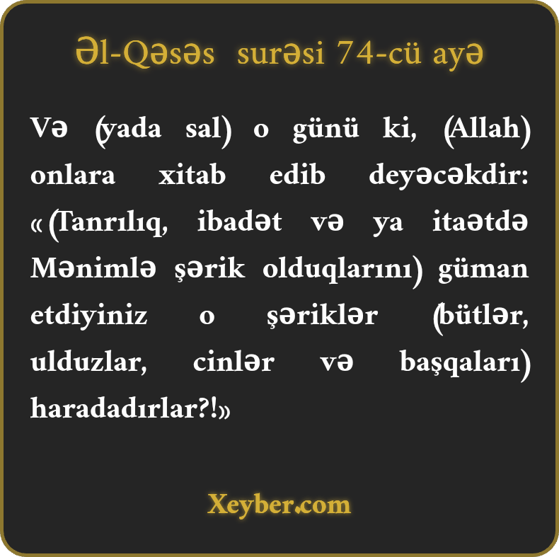 Və (yada sal) o günü ki, (Allah) onlara xitab edib deyəcəkdir: «(Tanrılıq, ibadət və ya itaətdə Mənimlə şərik olduqlarını) güman etdiyiniz o şəriklər (bütlər, ulduzlar, cinlər və başqaları) haradadırlar?!»