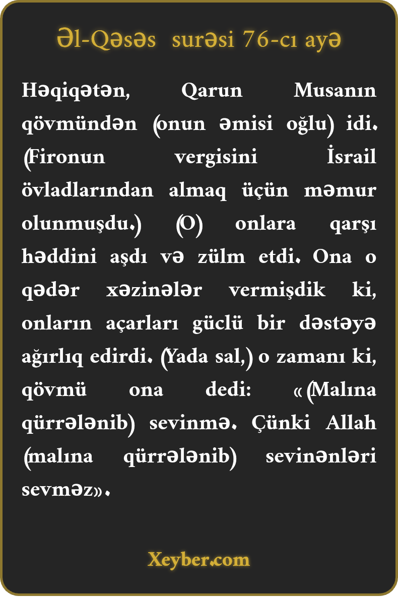 Həqiqətən, Qarun Musanın qövmündən (onun əmisi oğlu) idi. (Fironun vergisini İsrail övladlarından almaq üçün məmur olunmuşdu.) (O) onlara qarşı həddini aşdı və zülm etdi. Ona o qədər xəzinələr vermişdik ki, onların açarları güclü bir dəstəyə ağırlıq edirdi. (Yada sal,) o zamanı ki, qövmü ona dedi: «(Malına qürrələnib) sevinmə. Çünki Allah (malına qürrələnib) sevinənləri sevməz».