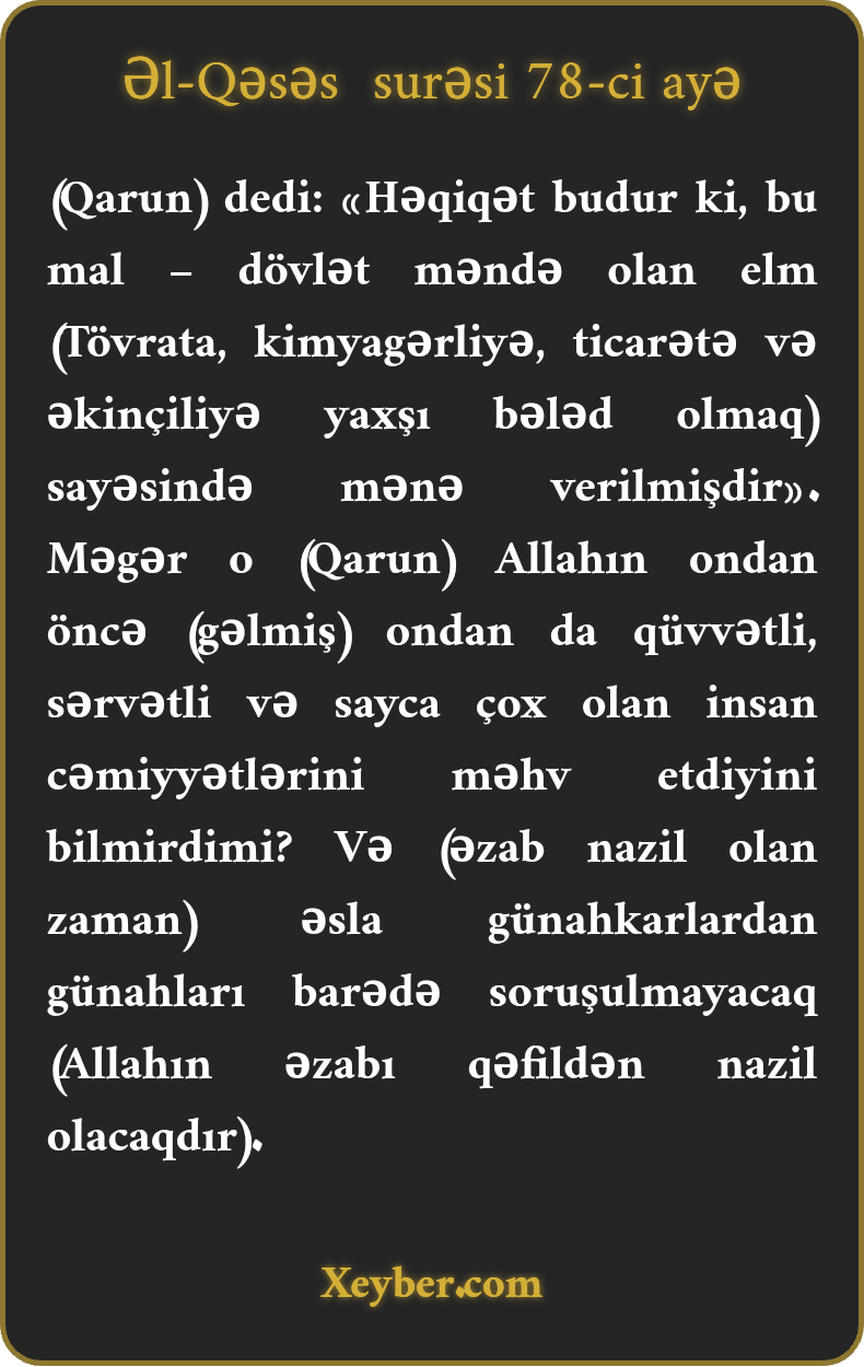 (Qarun) dedi: «Həqiqət budur ki, bu mal – dövlət məndə olan elm (Tövrata, kimyagərliyə, ticarətə və əkinçiliyə yaxşı bələd olmaq) sayəsində mənə verilmişdir». Məgər o (Qarun) Allahın ondan öncə (gəlmiş) ondan da qüvvətli, sərvətli və sayca çox olan insan cəmiyyətlərini məhv etdiyini bilmirdimi? Və (əzab nazil olan zaman) əsla günahkarlardan günahları barədə soruşulmayacaq (Allahın əzabı qəfildən nazil olacaqdır).