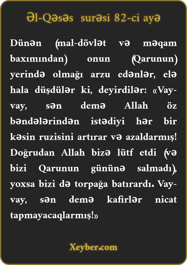 Dünən (mal-dövlət və məqam baxımından) onun (Qarunun) yerində olmağı arzu edənlər, elə hala düşdülər ki, deyirdilər: «Vay-vay, sən demə Allah öz bəndələrindən istədiyi hər bir kəsin ruzisini artırar və azaldarmış! Doğrudan Allah bizə lütf etdi (və bizi Qarunun gününə salmadı), yoxsa bizi də torpağa batırardı. Vay-vay, sən demə kafirlər nicat tapmayacaqlarmış!»
