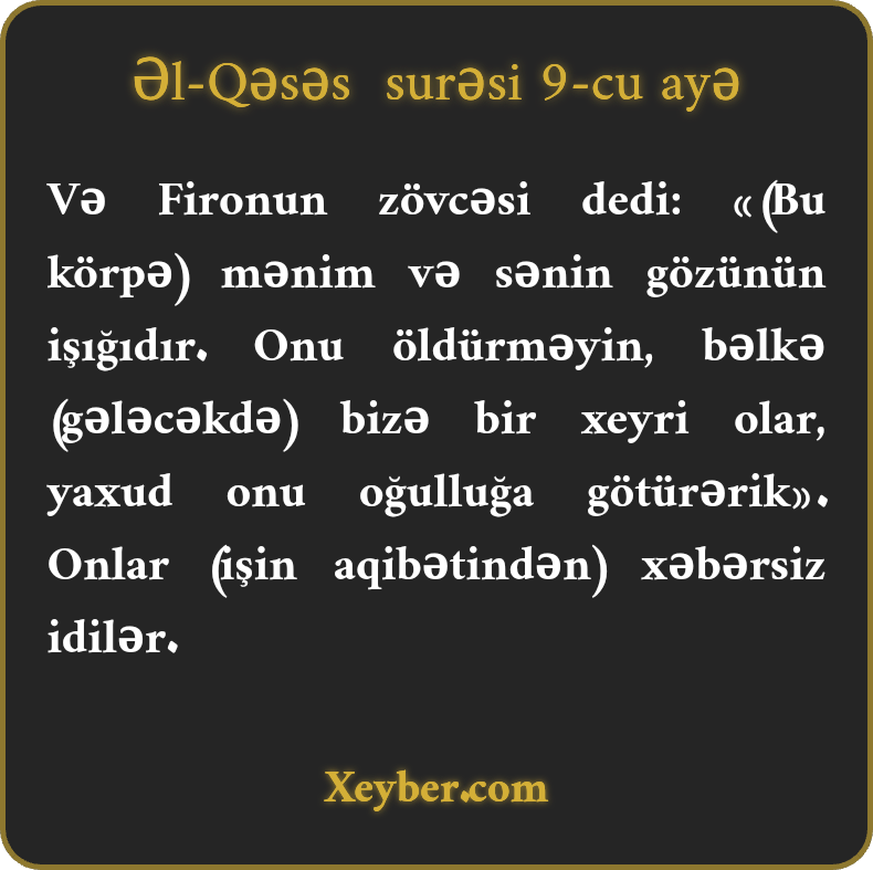 Və Fironun zövcəsi dedi: «(Bu körpə) mənim və sənin gözünün işığıdır. Onu öldürməyin, bəlkə (gələcəkdə) bizə bir xeyri olar, yaxud onu oğulluğa götürərik». Onlar (işin aqibətindən) xəbərsiz idilər.