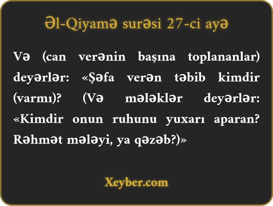 Və (can verənin başına toplananlar) deyərlər: «Şəfa verən təbib kimdir (varmı)? (Və mələklər deyərlər: «Kimdir onun ruhunu yuxarı aparan? Rəhmət mələyi, ya qəzəb?)»