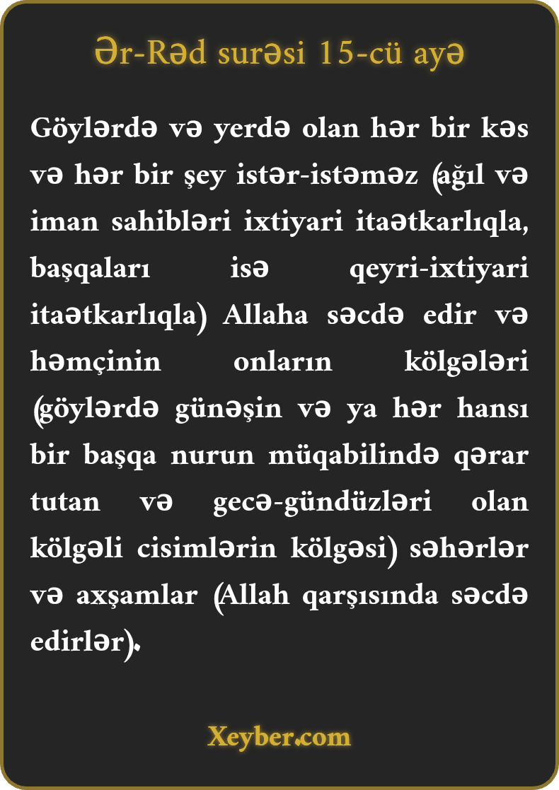 "Göylərdə və yerdə olan hər kəs istər-istəməz öz kölgəsi ilə Allaha səcdə edir.”