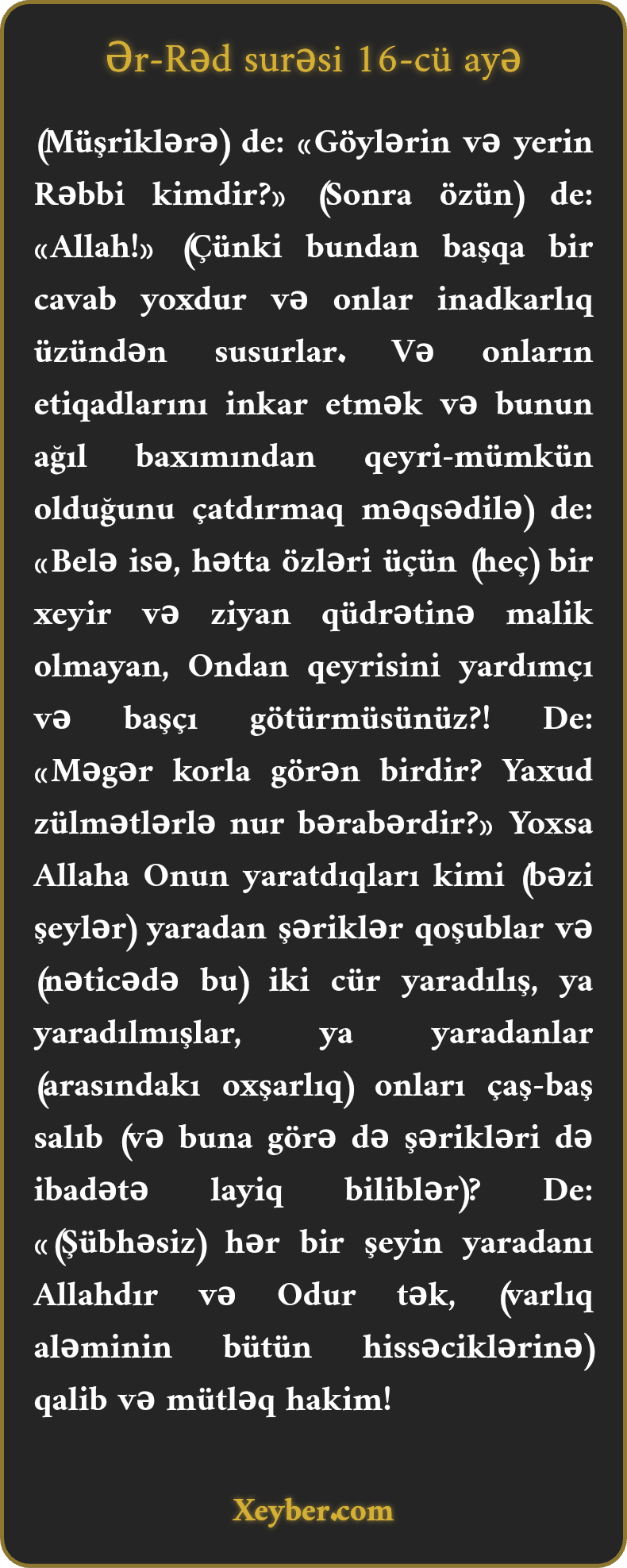"De ki, göylərin və yerin Rəbbi kimdir? De ki, Allahdır. De ki, bəs nə üçün Ondan qeyrilərini hami götürmüsünüz? De ki, görməyənlə görən bir-birinə bərabərdirmi? Məgər qaranlıqlar və aydınlıqlar eynidirmi? Yoxsa Allaha Onun kimi yaradan və yaratdığı onlara oxşar görünən şəriklərmi qərar verdilər? De ki, Allah hər şeyin xaliqidir və Odur yeganə qalib.”