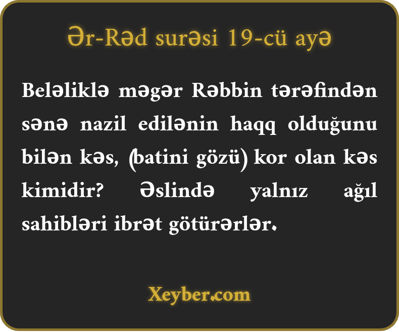 "Məgər Rəbbin tərəfindən sənə nazil olanın haqq olduğunu bilənlə görməyən kəs eynidirmi? Həqiqətən, yalnız düşüncə sahibləri öyüd götürür.”
