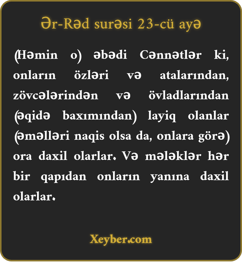 "Özlərinin, saleh ataları, zövcələri və övladlarından hər kəsin daxil olacağı əbədi bağlar var. Mələklər hər bir qapıdan (təbrik üçün) onların yanına gələr.”