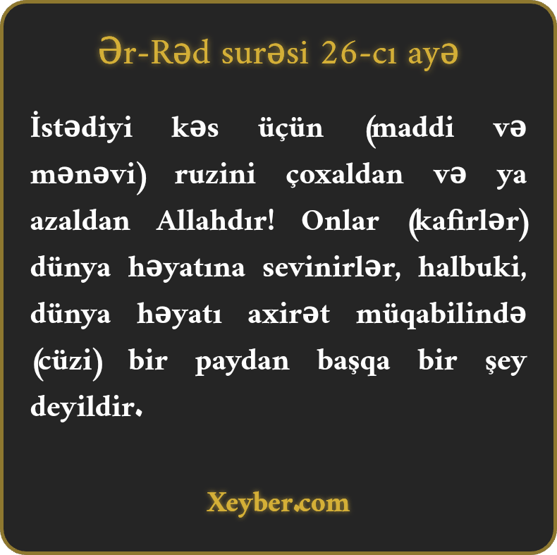 "Allah istədiyi kəsin ruzisini artırar və ya əskildər. (İnsanlar) dünya həyatına heyrandırlar. Halbuki dünya həyatı axirətlə müqayisədə bir dəfə kam almaqdan başqa bir şey deyil.”
