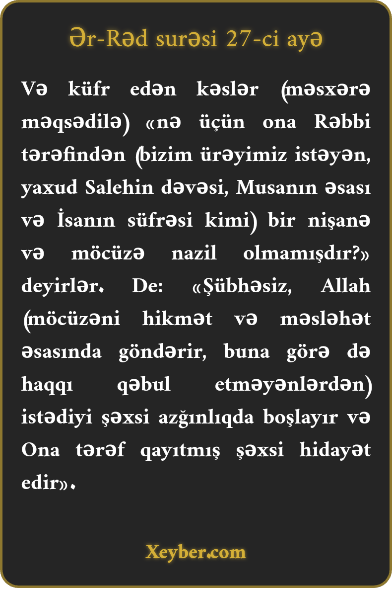 "Kafirlər deyirlər: «Nə üçün Rəbbi tərəfindən ona (biz istədiyimiz) möcüzə nazil olmayıb?» De ki, həqiqətən, Allah istədiyiin azdırar, Ona üz tutub tövbə edəni Özünə doğru hidayət edər.”