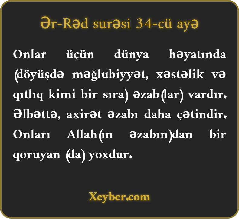 "Onlar üçün dünya həyatında əzab var. Şübhəsiz, axirət əzabı daha ağırdır və Allahın qarşısında onları hifz edəcək kimsə yoxdur.”