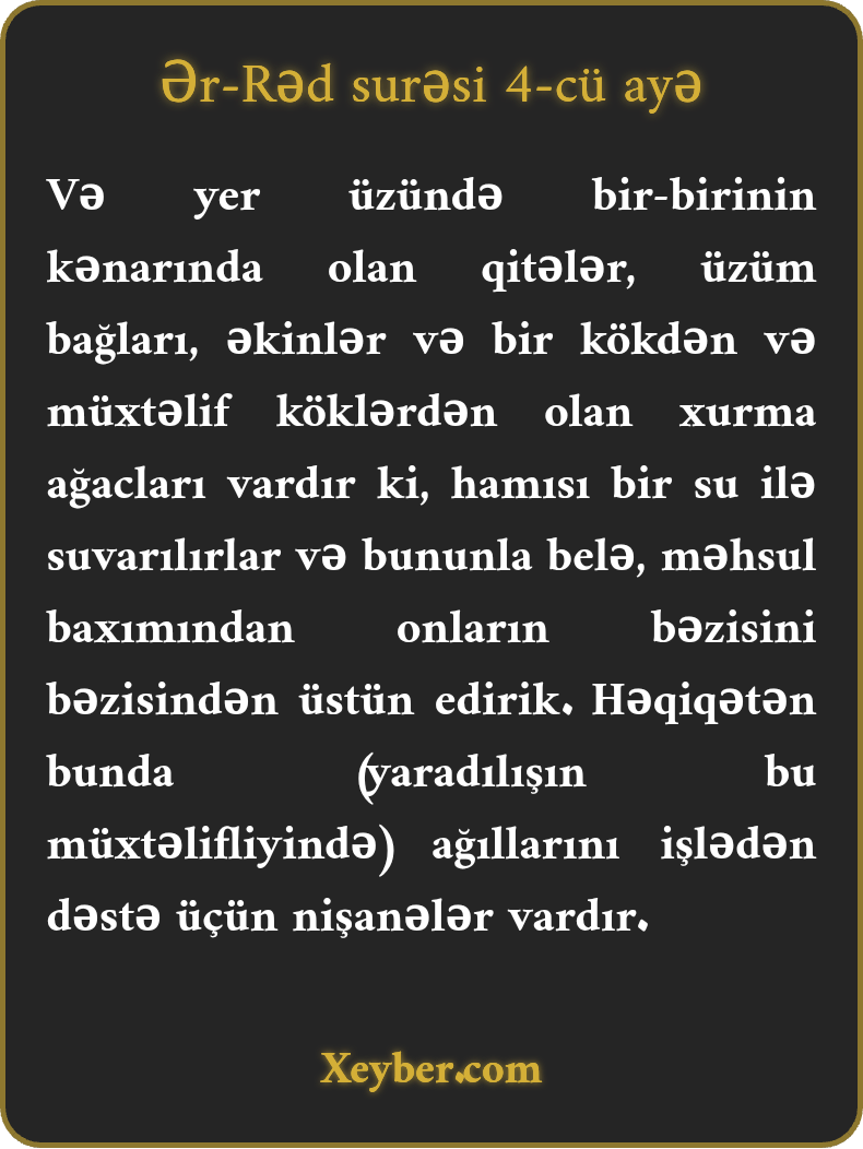 "Yer üzündə bir-birinə yaxın qitələr, hamısı eyni bir su ilə suvarılan, növbənöv üzümü olan bağlar, əkinəcəklər, oxşar və oxşar olmayan xurma bağları vardır. Yemək üçün bəzi meyvələri bəzilərindən üstün etdik. Həqiqətən, bunda düşünən insanlar üçün qəti dəlillər var.”