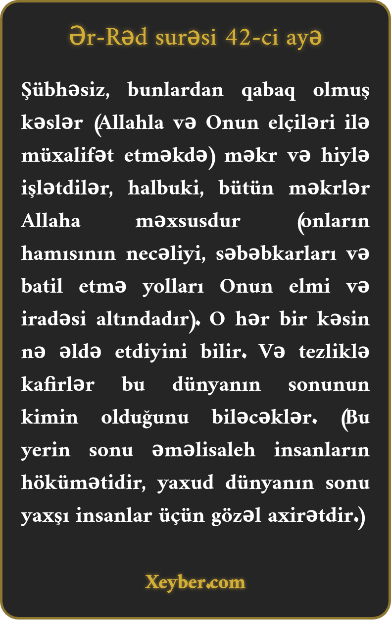 "Əlbəttə, onlardan əvvəlkilər məkr işlətdilər. (Bunun faydası olmadı, çünki) bütün tədbirlər və məkrlər Allahın ixtiyarındadır. O kimin nə kəsb etdiyini bilir və kafirlər tezliklə biləcəklər ki, axirət evi kimindir.”