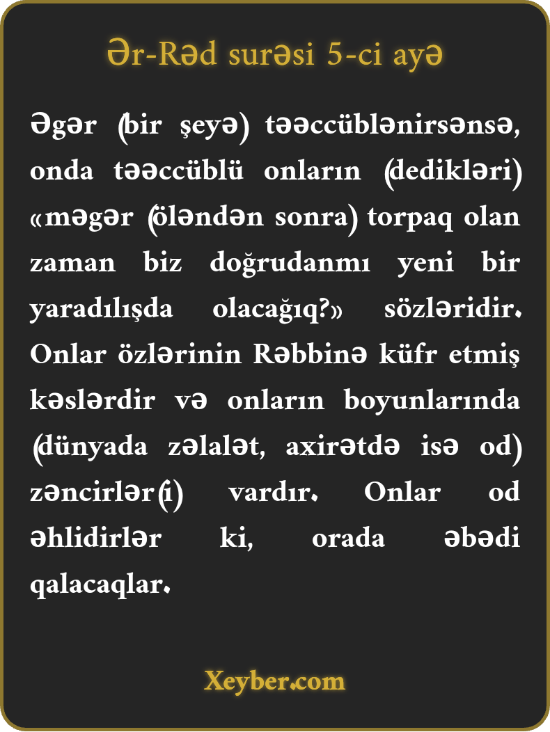 "Əgər təəccüb edirsənsə, təəccüblü onların sözləridir. (Deyirlər ki,) torpaq olduqdan sonra yenidənmi yaradılacağıq? Onlar Rəbbinə küfr edən kəslərdir. Onlardır boyunlarında zəncir olanlar, onlardır əbədi qalacaqları oda həmdəm olanlar.”