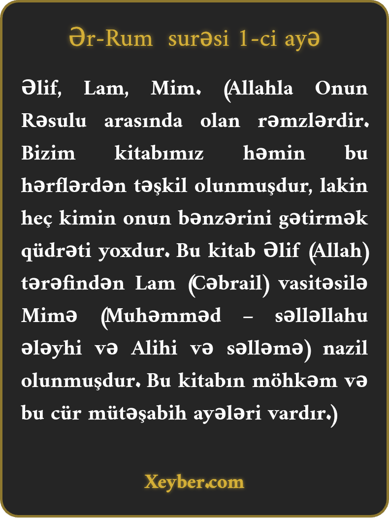 Əlif, Lam, Mim. (Allah">(Allahla Onun Rəsulu arasında olan rəmzlərdir. Bizim kitabımız həmin bu hərflərdən təşkil olunmuşdur, lakin heç kimin onun bənzərini gətirmək qüdrəti yoxdur. Bu kitab Əlif (Allah) tərəfindən Lam (Cəbrail) vasitəsilə Mimə (Muhəmməd – səlləllahu ələyhi və Alihi və səlləmə) nazil olunmuşdur. Bu kitabın möhkəm və bu cür mütəşabih ayələri vardır.)