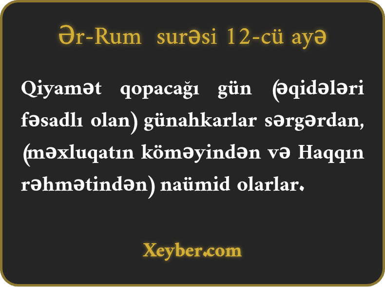 Qiyamət qopacağı gün (əqidələri fəsadlı olan) günahkarlar sərgərdan, (məxluqatın köməyindən və Haqqın rəhmətindən) naümid olarlar.