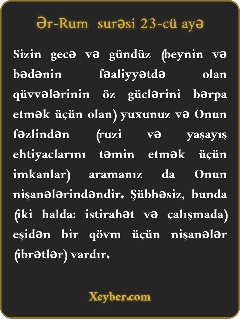 Sizin gecə və gündüz (beynin və bədənin fəaliyyətdə olan qüvvələrinin öz güclərini bərpa etmək üçün olan) yuxunuz və Onun fəzlindən (ruzi və yaşayış ehtiyaclarını təmin etmək üçün imkanlar) aramanız da Onun nişanələrindəndir. Şübhəsiz, bunda (iki halda: istirahət və çalışmada) eşidən bir qövm üçün nişanələr (ibrətlər) vardır.