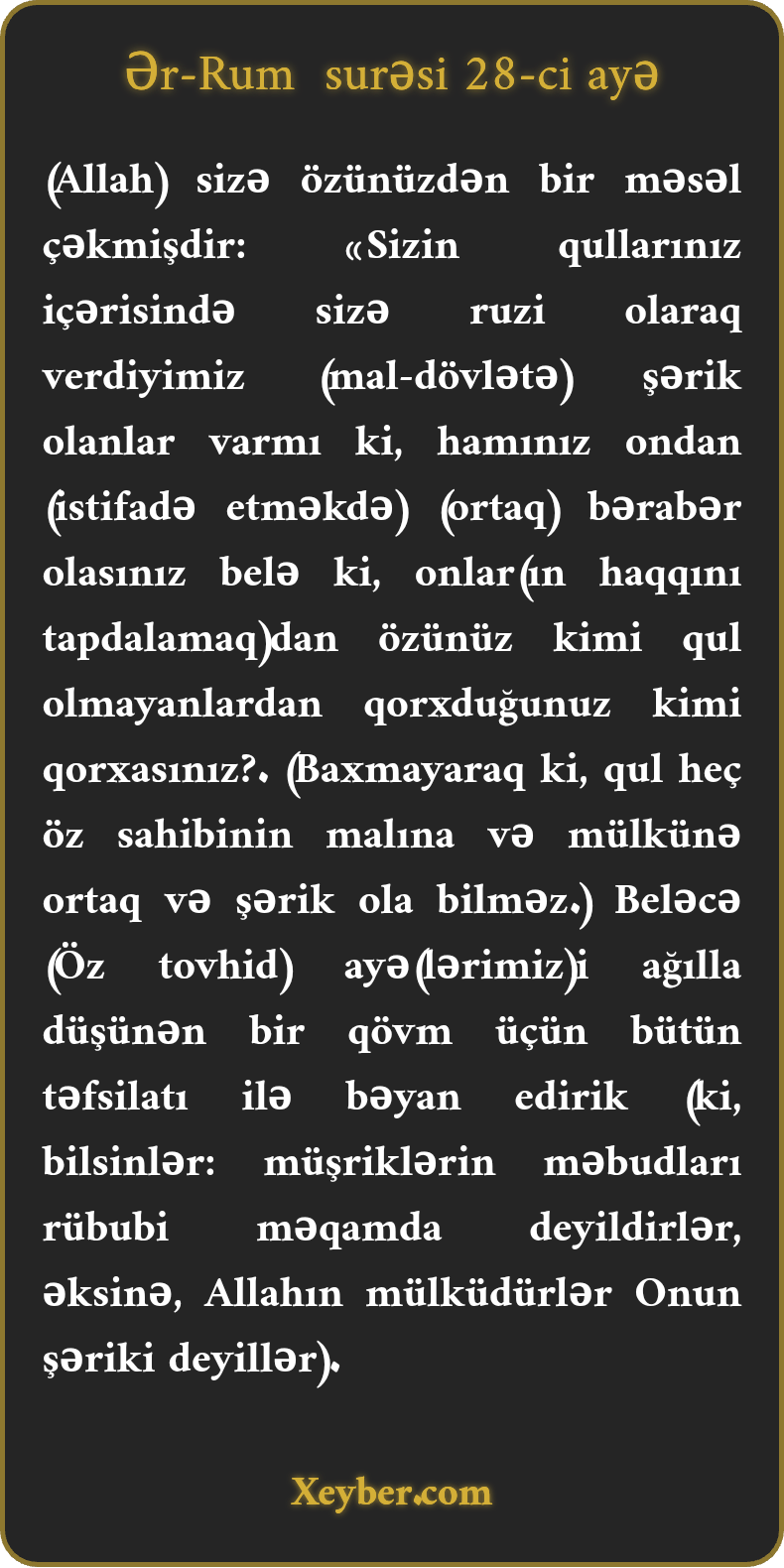 (Allah) sizə özünüzdən bir məsəl çəkmişdir: «Sizin qullarınız içərisində sizə ruzi olaraq verdiyimiz (mal-dövlətə) şərik olanlar varmı ki, hamınız ondan (istifadə etməkdə) (ortaq) bərabər olasınız belə ki, onlar(ın haqqını tapdalamaq)dan özünüz kimi qul olmayanlardan qorxduğunuz kimi qorxasınız?. (Baxmayaraq ki, qul heç öz sahibinin malına və mülkünə ortaq və şərik ola bilməz.) Beləcə (Öz tovhid) ayə(lərimiz)i ağılla düşünən bir qövm üçün bütün təfsilatı ilə bəyan edirik (ki, bilsinlər: müşriklərin məbudları rübubi məqamda deyildirlər, əksinə, Allahın mülküdürlər Onun şəriki deyillər).