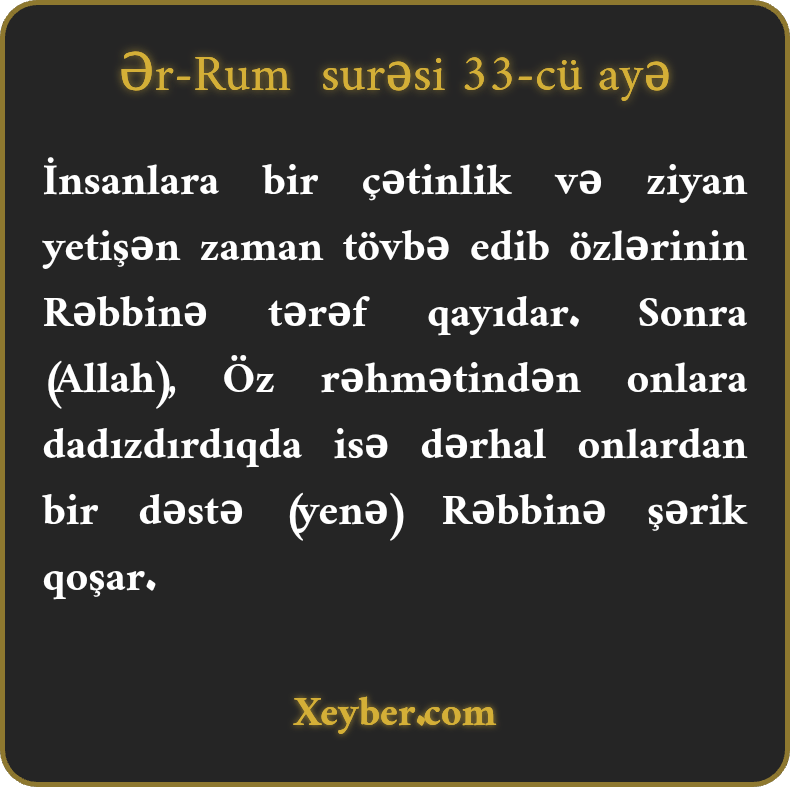 İnsanlara bir çətinlik və ziyan yetişən zaman tövbə edib özlərinin Rəbbinə tərəf qayıdar. Sonra (Allah), Öz rəhmətindən onlara dadızdırdıqda isə dərhal onlardan bir dəstə (yenə) Rəbbinə şərik qoşar.