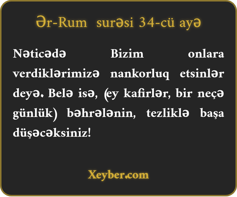 Nəticədə Bizim onlara verdiklərimizə nankorluq etsinlər deyə. Belə isə, (ey kafirlər, bir neçə günlük) bəhrələnin, tezliklə başa düşəcəksiniz!