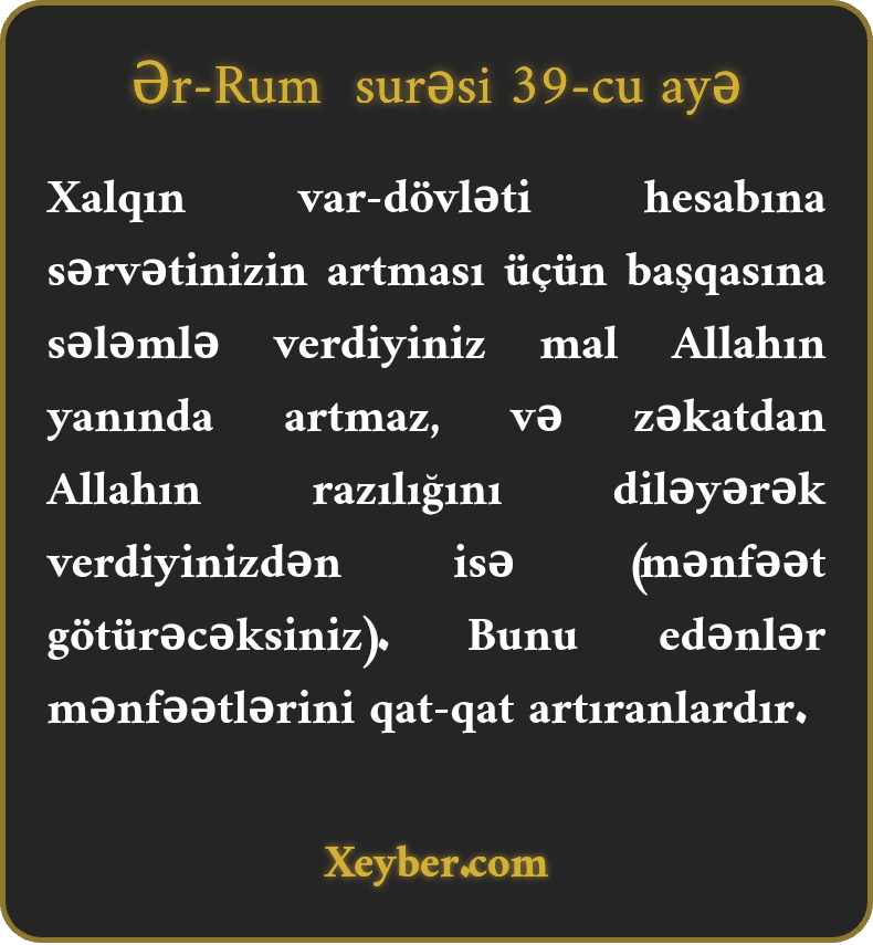 Xalqın var-dövləti hesabına sərvətinizin artması üçün başqasına sələmlə verdiyiniz mal Allahın yanında artmaz, və zəkatdan Allahın razılığını diləyərək verdiyinizdən isə (mənfəət götürəcəksiniz). Bunu edənlər mənfəətlərini qat-qat artıranlardır.